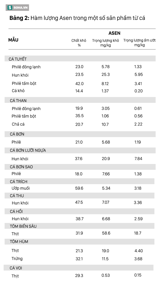 Nhiều phân tích được tiến hành ở một số nước như Indonesia, Na Uy cho thấy đa số các loại hải sản đều chứa hàm lượng arsen tương đối cao. Ví dụ bảng dưới đây cho biết hàm lượng arsen và thủy ngân trong một số loài cá của Indonesia và Nauy [4,5]: