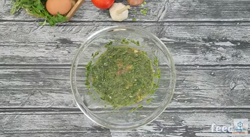 Cho 3 quả trứng gà, 1 thìa cà phê hạt nêm, 1/2 thìa cà phê hạt tiêu, 1/2 thìa cà phê bột ngọt vào bát rồi quấy đều. Sau đó cho thịt heo xay, 20g lá ngải cứu băm nhỏ vào trộn chung.