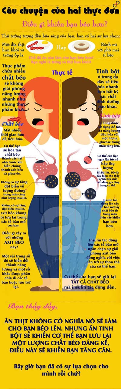Điều này không chứng minh rằng ăn đồ ăn chứa chất béo sẽ không khiến bạn béo phì hoặc tăng cân. Nhưng cũng không thể phủ nhận một điều rằng, ăn thịt không có nghĩa sẽ làm bạn béo lên nhanh chóng nhưng ăn tinh bột sẽ khiến cơ thể bạn lưu lại một lượng chất béo đáng kể, khiến bạn tăng cân.