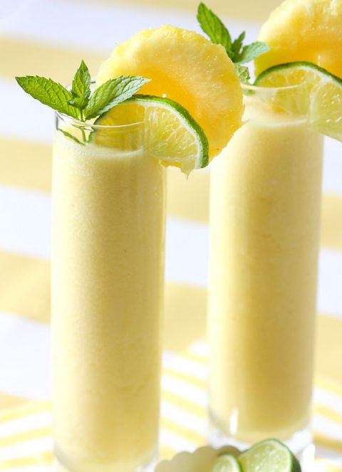 – Cho nước ép thơm, nước cốt chanh, nước cốt dừa, rượu rum và ít đá viên vào máy xay sinh tố, xay 20 giây cho hỗn hợp hòa trộn.
